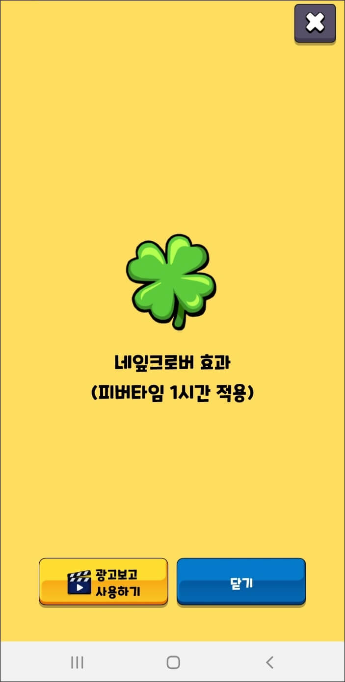 화면의 네잎클로버를 누르게 되면 광고를 시청을 하게 되는데요. 머니 생산속도가 빨라지게 됩니다. 빠르게 돈을 모으려면 주기적으로 네잎클로버를 수시로 눌러줘야 됩니다.